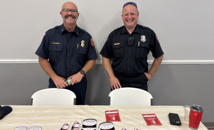 Two fire fighters smiling behind a table of give-aways.