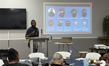 Sergeant Johnson at the podium speaking to the attendees.