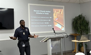 A police officer presenting about church safety measures.
