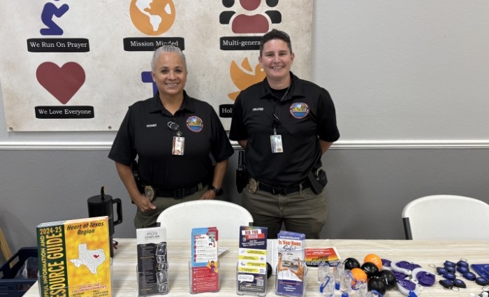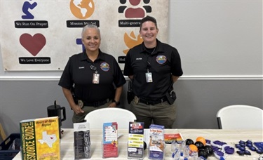 Two police officers smiling at a table of information and give-away items.